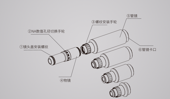 物镜为通用结构,通过切换管镜,可实现10X、20X、35X、50X的倍率切换。(管镜组合图)