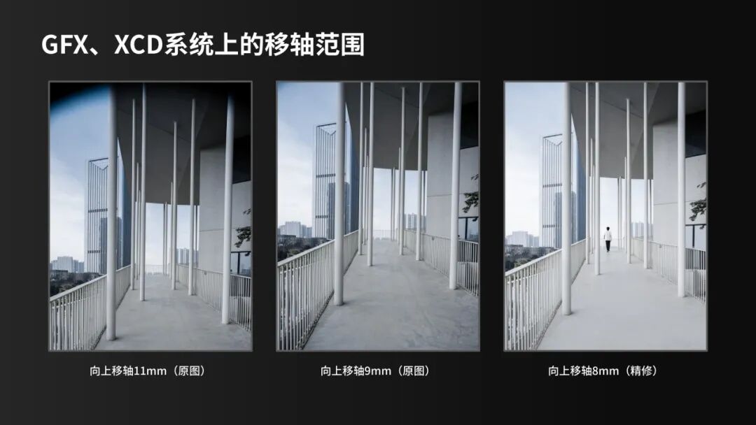 在GFX和XCD中画幅机身上,这颗镜头不出现暗边的最大移轴量为±8mm。我选择了长沙芒果马栏山广场曲折的坡道进行测试:当移轴量超过8mm时,边缘会出现暗圈;但在8mm范围内,画面纯净而稳定,足以应对建筑摄影的严谨要求。