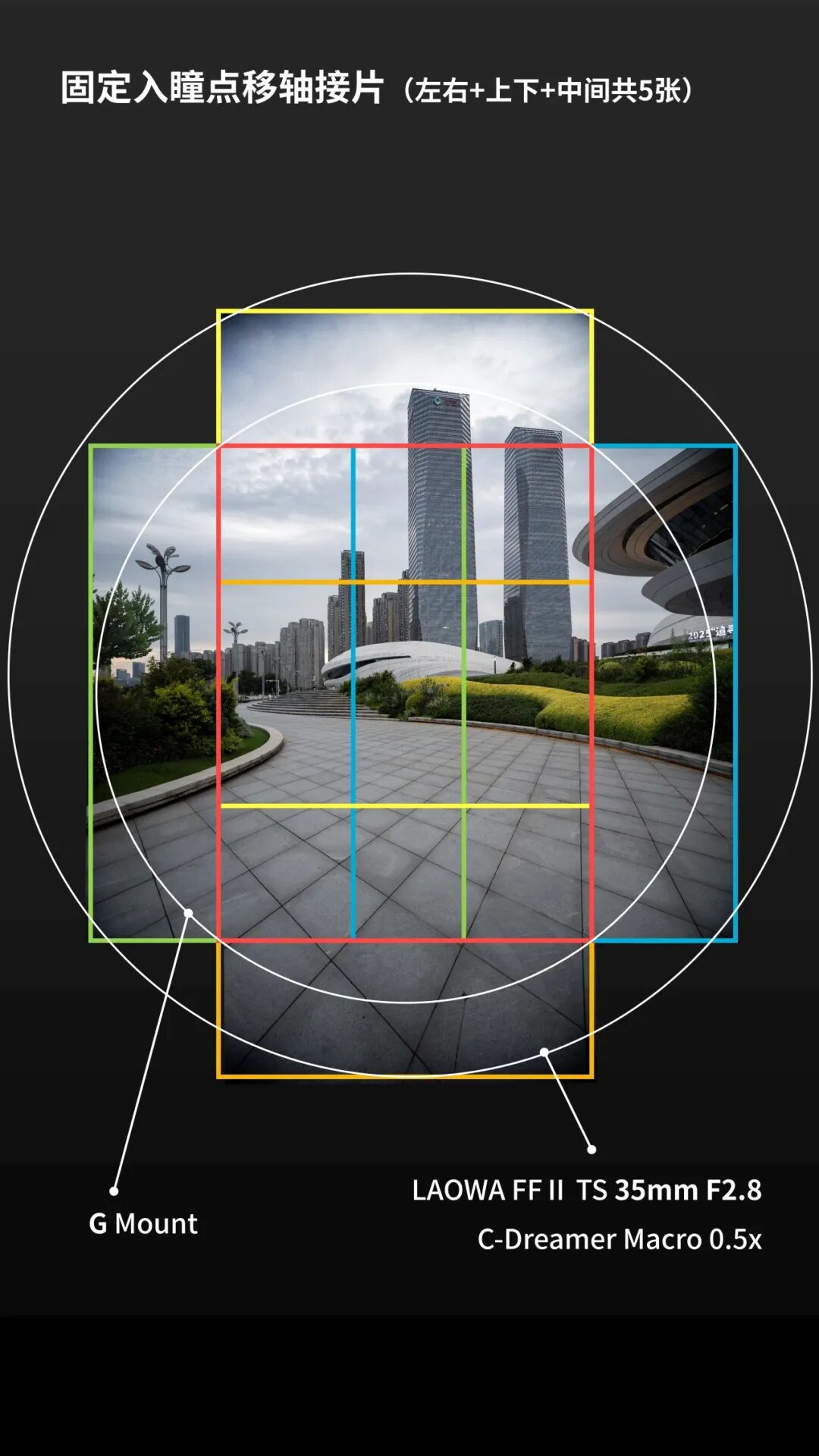 通过镜头上的旋钮,可以快速切换拍摄角度,我使用“上、中、下”三张画面,再结合左右移轴,完成了一组五张接片。