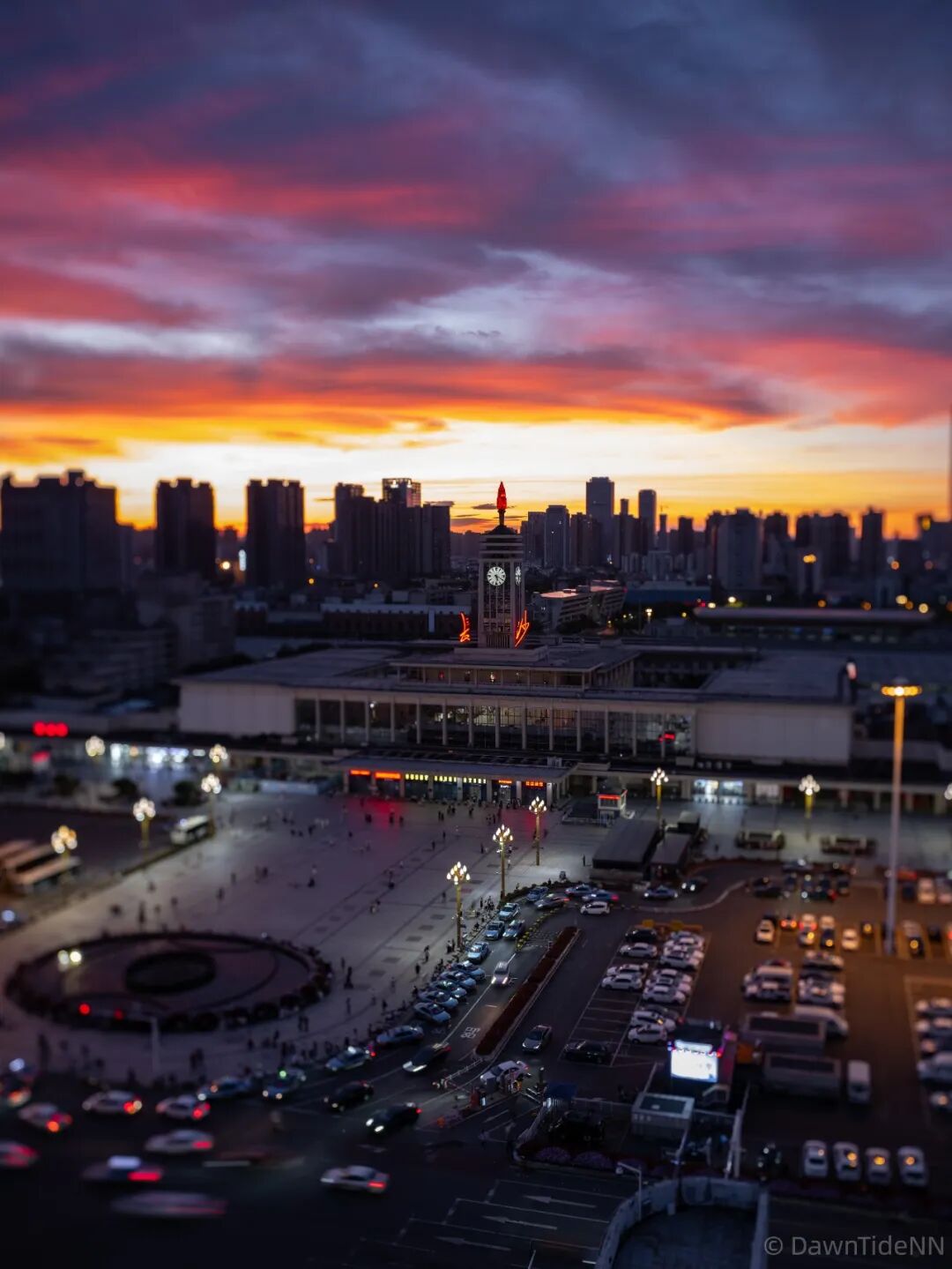 画面中,我将火车站标志性的火炬与“长沙”二字放入合焦区域,而前景的车流和背景的朝霞则适度虚化,形成了清晰与朦胧的对比。这种控制感,让镜头不仅能表现宏大的场景,也能在细节处展现创意与张力。