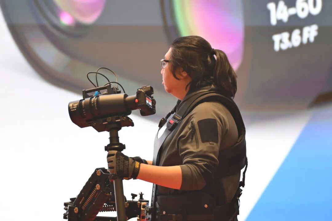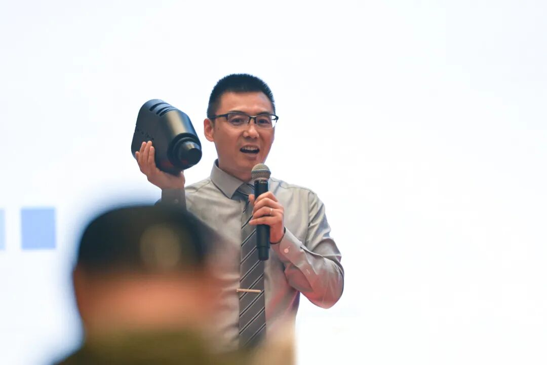晚宴的重头戏在万众期待中到来——总经理李大勇先生亲自登台,为老蛙镜头全新产品揭幕。随着他的介绍,资深摄影师潇潇登台协助,共同展示了新款3D全景镜头!