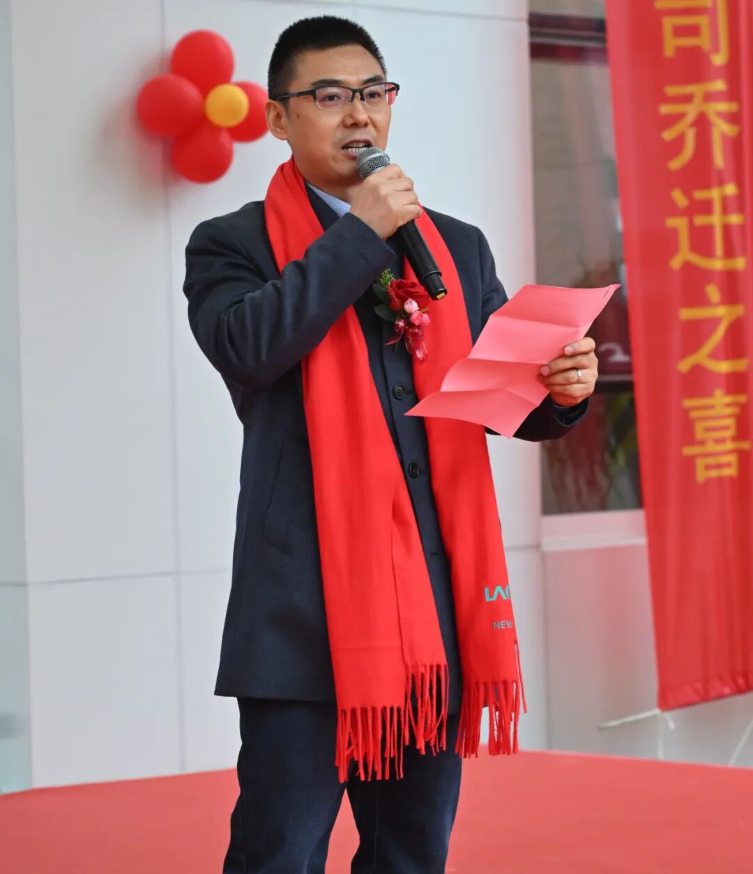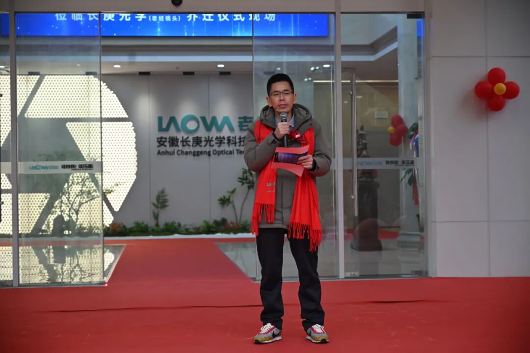 最后,安徽长庚光学科技有限公司(老蛙镜头)总经理李大勇为乔迁揭幕仪式致辞。他回顾了团队一路走来的坚实足迹,感谢每一位员工的付出与伙伴们的信任。