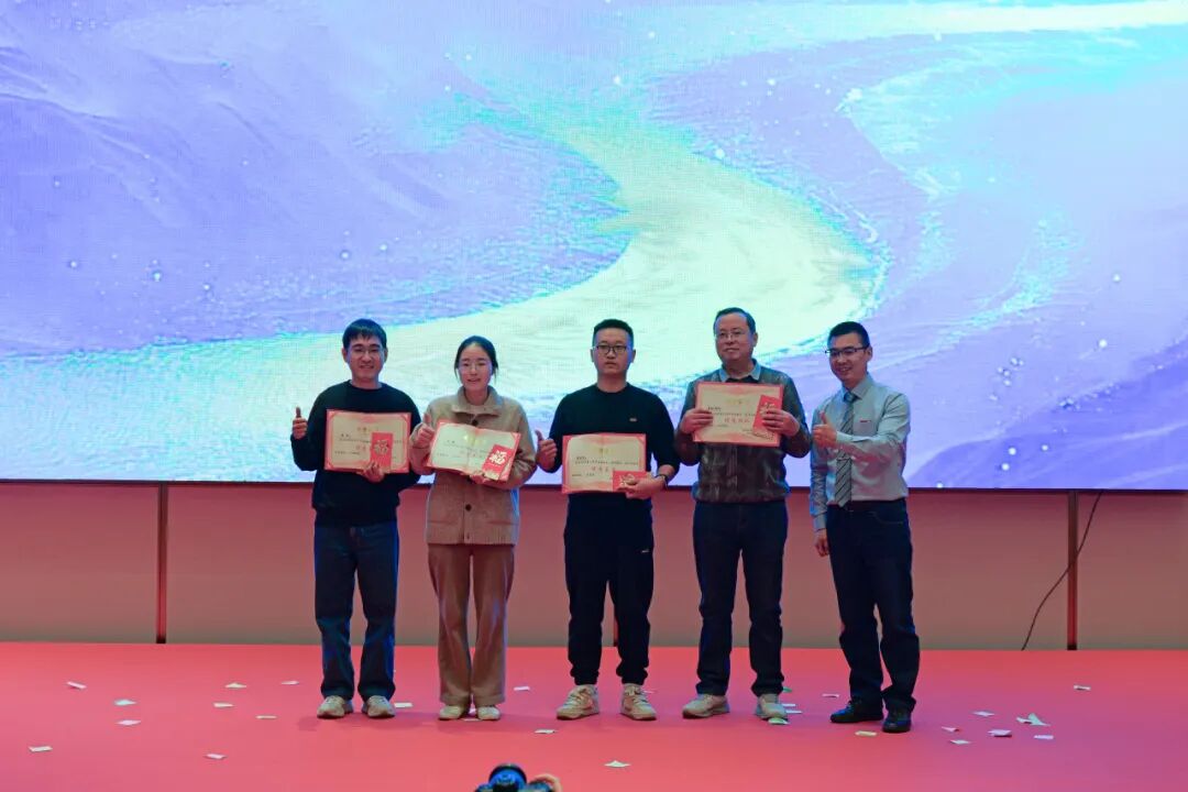 机械设计部李陈(左一)、营业部吴爽(左二)、金加工车间李亚龙(左三)三名获得 “年度优秀个人” 荣誉称号;生产组装车间获得 “年度优秀团队” 荣誉称号(左四)。