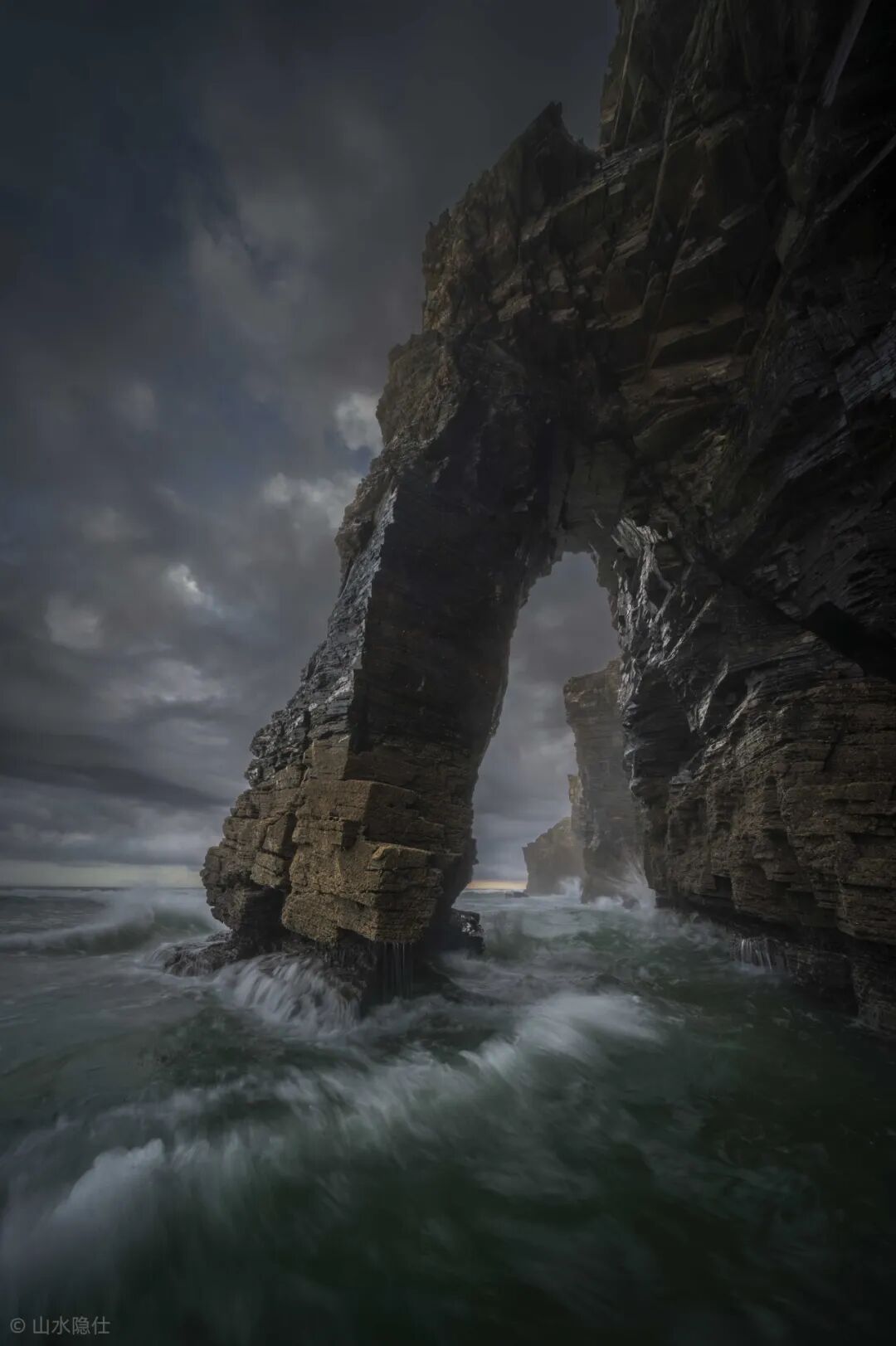 如果说欧洲除了阿尔卑斯山的雪山草甸吸引我,那么想必西班牙的大海也具备了天然魔幻般的场景。实际上,在拍摄奇幻海域这幅作品也是冒着巨大的危险,甚至可以说这样的前景浪花在全网也是独一无二的。在前一天确认潮汐拍摄最佳高度后的清晨,接近满潮时我就沿着海岸边深入挺进核心石门区域。