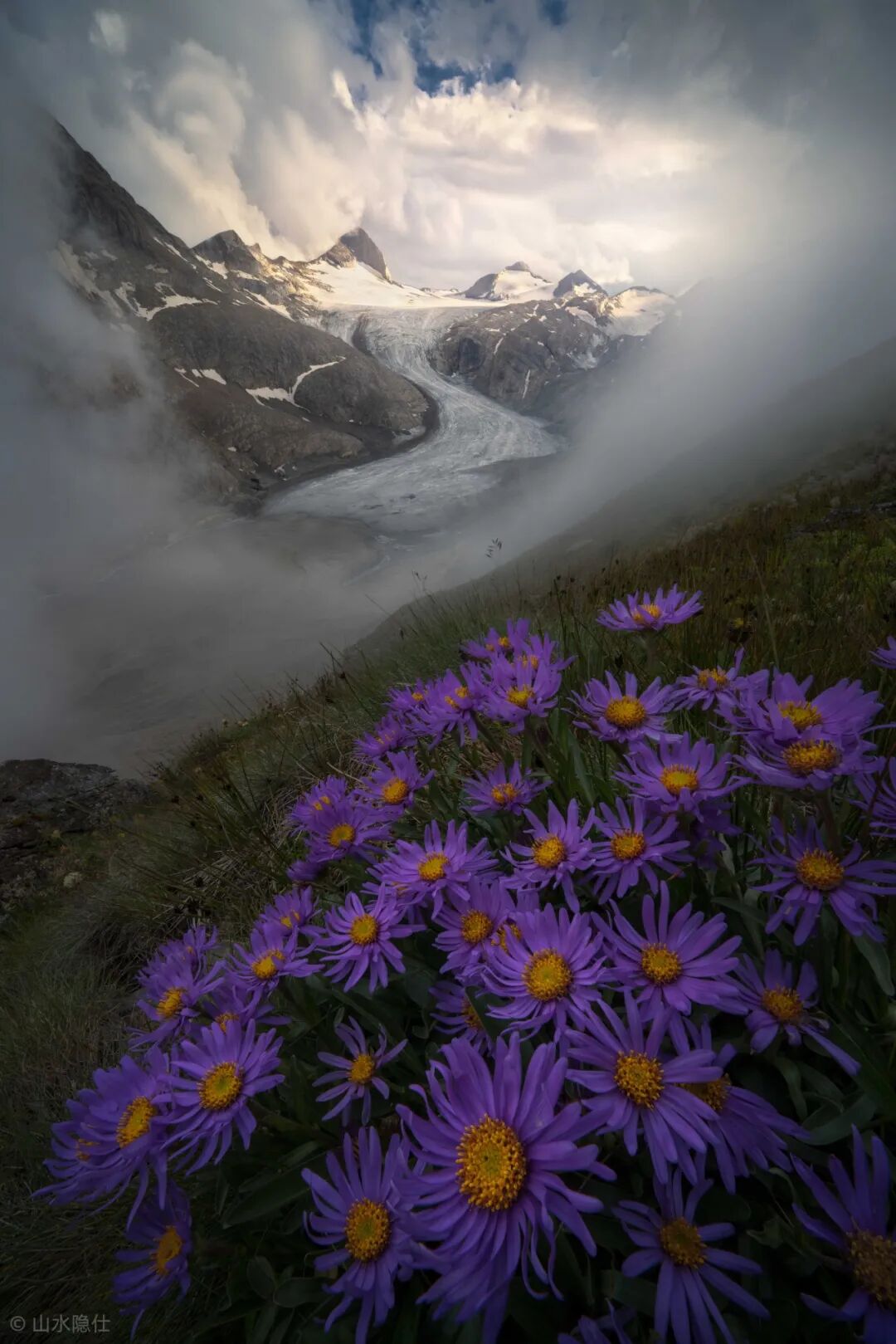 在走完雨天的溪流之后,我在卫星地图上发现了一处s弯小型冰川,结合驴友手机拍摄反馈确定这是一处具有价值和潜力的拍摄点位,由于冰川地带海拔较高,气温往往偏低,意味着哪怕是在八月初这里可能依旧存在花丛前景,且这里几乎少有人知。