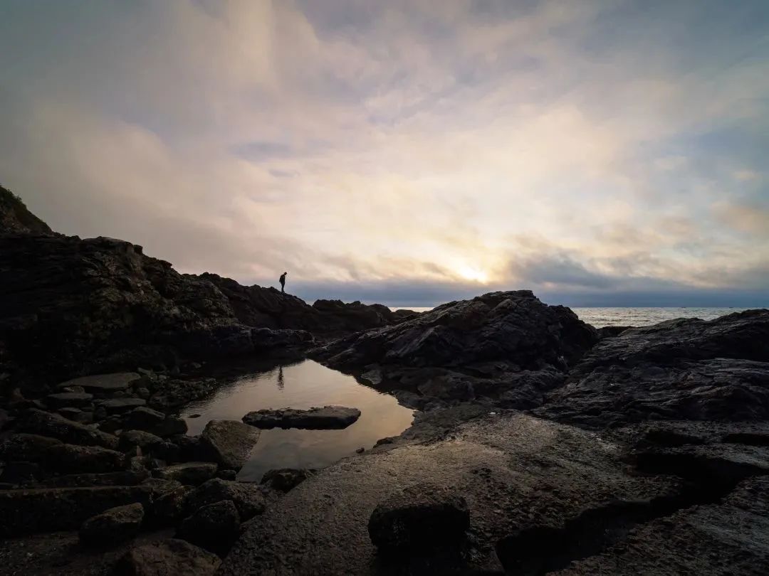 在我准备收工往回走时,一小伙恰好登上了礁石,下方水洼恰好能映出倒影,水洼边缘与阴影形成的尖尖恰好能给人带来一些视线引导,远处太阳恰好从云层里冒了个头,于是我得到了此行中真正满意的相片。