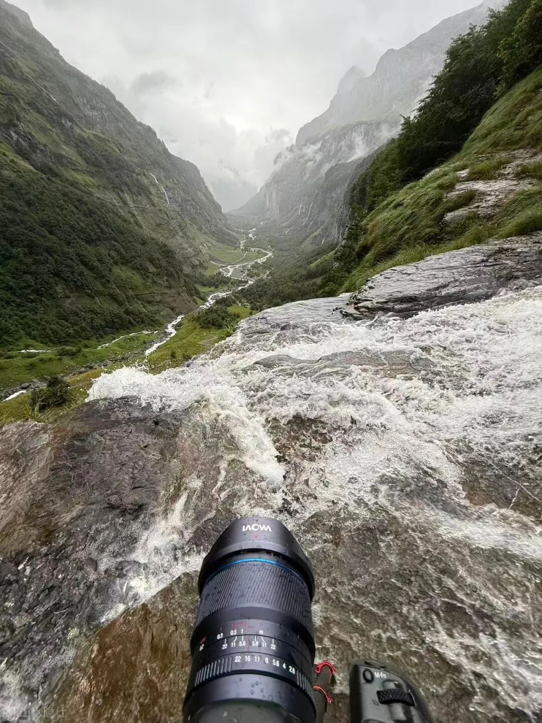 镜头转向瑞士——这是我第二次来了。都说欣赏瑞士最好的方式是徒步,我依旧选了一个下雨天,充沛的雨量能保证远处的瀑布群足够的壮观,同时雨天造就的云雾就像给画面施加了一层魔法,显得神秘而又美丽。