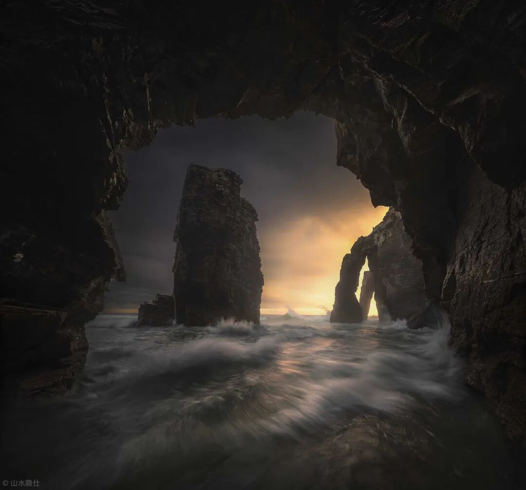 如果说欧洲除了阿尔卑斯山的雪山草甸吸引我,那么想必西班牙的大海也具备了天然魔幻般的场景。实际上,在拍摄奇幻海域这幅作品也是冒着巨大的危险,甚至可以说这样的前景浪花在全网也是独一无二的。在前一天确认潮汐拍摄最佳高度后的清晨,接近满潮时我就沿着海岸边深入挺进核心石门区域。